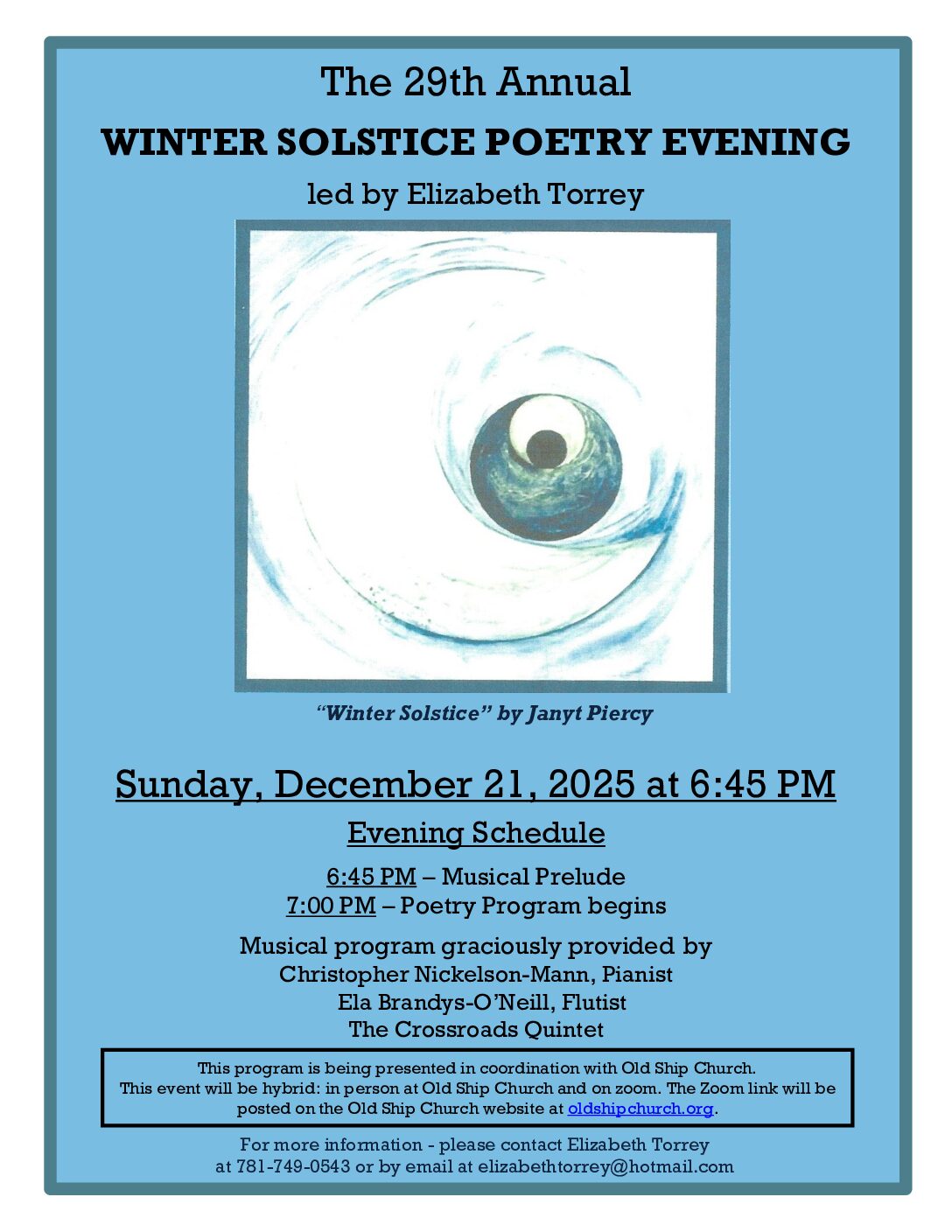 Old Ship Church is a liberal religious community that welcomes all to an open search for meaning, recognizing the interconnected web of existence and the importance of nourishing the spirit.